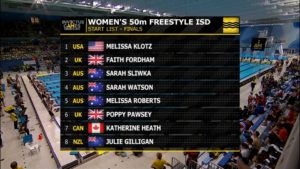 Jules was the 8th qualifier for this event and realistically wouldn’t push the top girls. I had had a chat earlier with Sarah S. as she had qualified third only a fraction of a second behind another Aussie. I briefly mentioned she would need to go hard from the start and really reach for the wall at the end. I hope I wasn’t contradicting what the Aussie coach Amy was advising her swimmers.