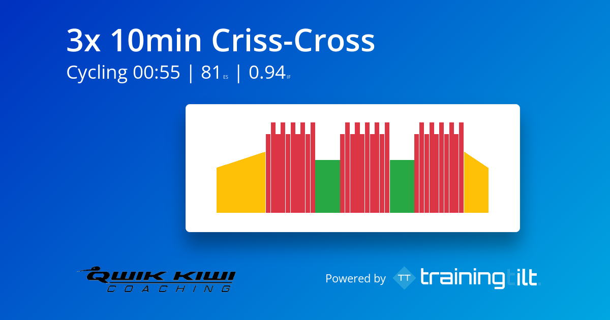 The main set is made up of three Criss-Cross reps of ten minutes duration with a five minutes Rest Interval (RI) at Level II between each Criss-Cross rep. A Criss-Cross rep starts off with one minute riding at Level IV, then a minute at Level V, alternating between the two intensities until the ten minutes is completed and you take your Rest Interval (RI).