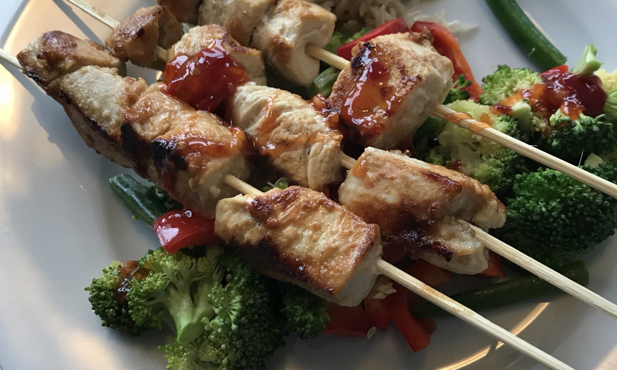 An easy meal that can be prepared ahead of time and then qwikly made just prior to dinner. * Soak wooden skewers in cold water … Continue reading Chef Ray – Chicken Skewers with Stir-fried Greens