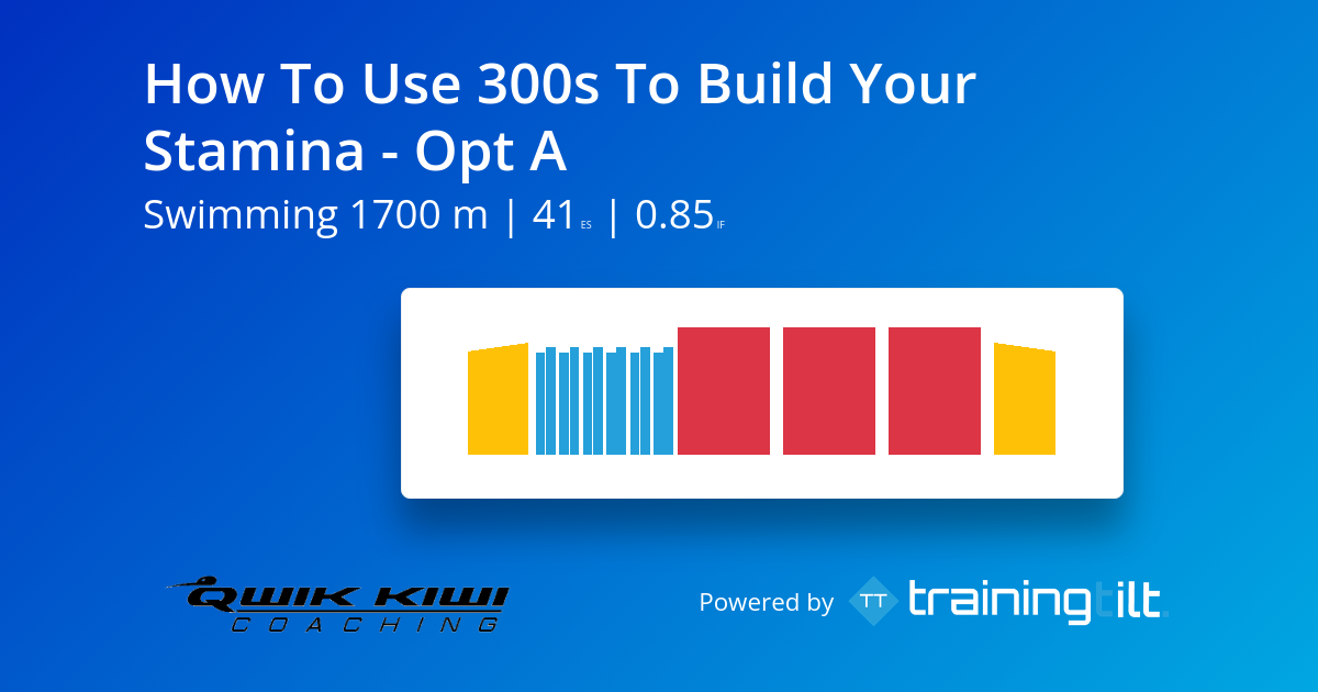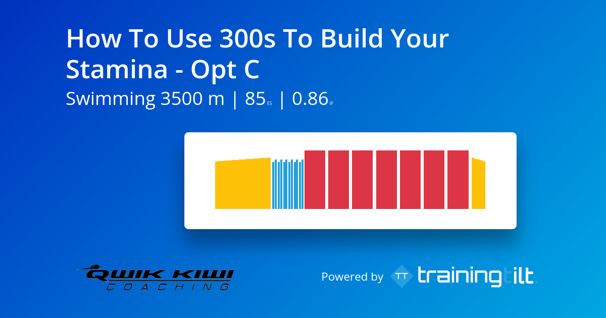 A good way to develop your stamina is to swim longer reps. 300m reps work well because it is a unique distance, that will require you to judge your pacing. This will challenge you cognitively as well as physiologically. This session is perfect for Ironman and Olympic distance triathletes or people doing longer ocean swims.