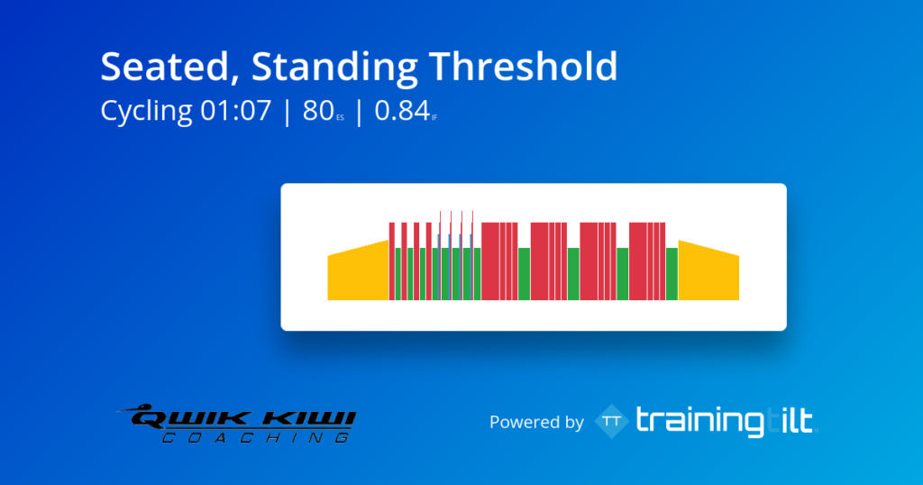 Riding at or around your Threshold will bring up both your ability to sustain high-intensity effort (as well as your suffering). Combine that with riding both in and out of the saddle will use different muscles and alter the training stimulus received. This session is great for triathletes, and road cyclists. It can also be beneficial for mountain bikers, especially for events that are about an hour in duration such as a 40km Time Trial or the bike leg of an Olympic Distance Triathlon.
