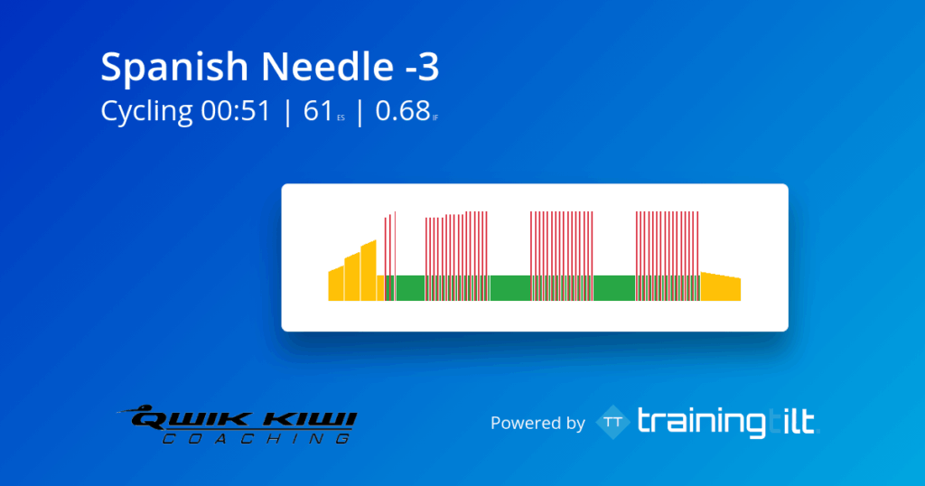 The inspiration for this session comes from a workout in an article on Eliel Cycling about their staff’s favourite workouts. You can read the article here. This is a precursor workout prior to doing the Full Spanish Needle. Credit for this workout belongs to Trainer Road who developed this series of workouts.