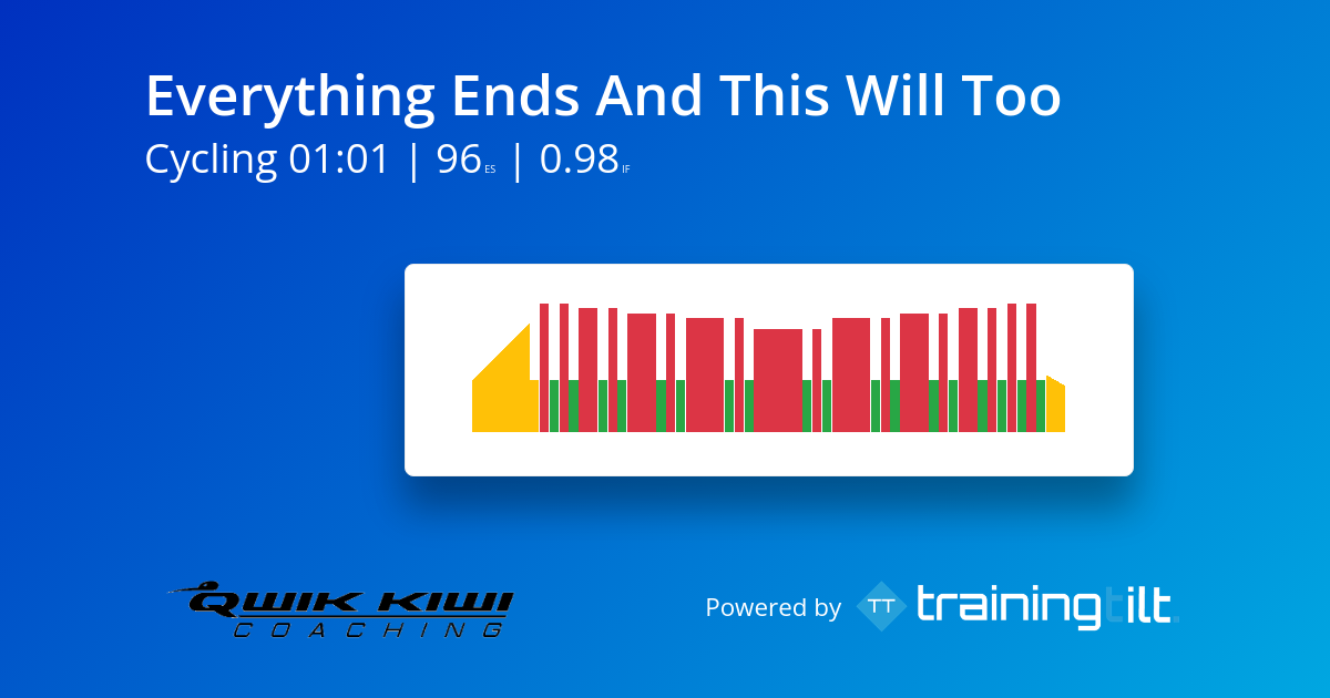 This workout is made up of multiple reps for multiple durations, starting shorter at a higher intensity, as the reps get longer the intensity decreases slightly; the cadence for this rep is 60 RPM in the first half of the workout and 85 RPM for the second half of the workout. With each rep it is also followed by a one-minute rep, the cadence for this (second) rep is 85 RPM in the first half of the workout and 60 RPM for the second half of the workout.
