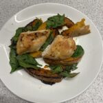 - Scatter lighlty washed baby spinach on top of pumpkin and returm tray to the oven for a further 2-3 minutes until spinach is just wilted.