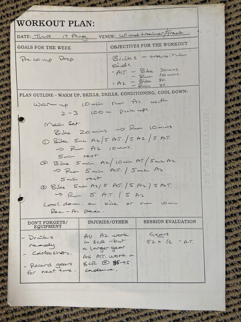 I’m not 100% sure where this workout came from. I found it amongst some of my old things. I suspect it comes from Ray Edwards who used to coach the NZ Triathlon Youth Development Squad back in the 1990’s which I was a part of. The workout is dated Thursday 17 Aug 1995.