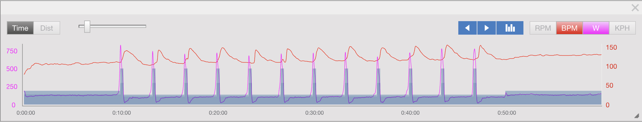 The main set is made up of twelve reps of twenty-seconds duration sprinting at max effort, followed by three minutes riding at Level I for you Rest Interval (RI).