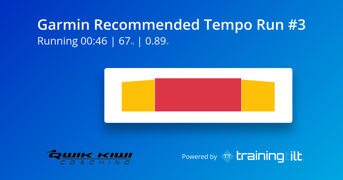 Tempo is an intensity that means different things to different athletes and coaches. For me, I define Tempo as an effort comfortably below the Threshold pace. It is the sort of intensity that if you had to you could maintain for a duration longer than a half marathon. A It is higher than the aerobic running pace, sort of in the mid-zone between the two levels. Spending more than 15-20 minutes at this intensity, helps the body practice clearing the small amount of lactic acid generated at this pace, without needing to slow down to do so. This is a perfect session for runners and triathletes running events up to full marathons and further.