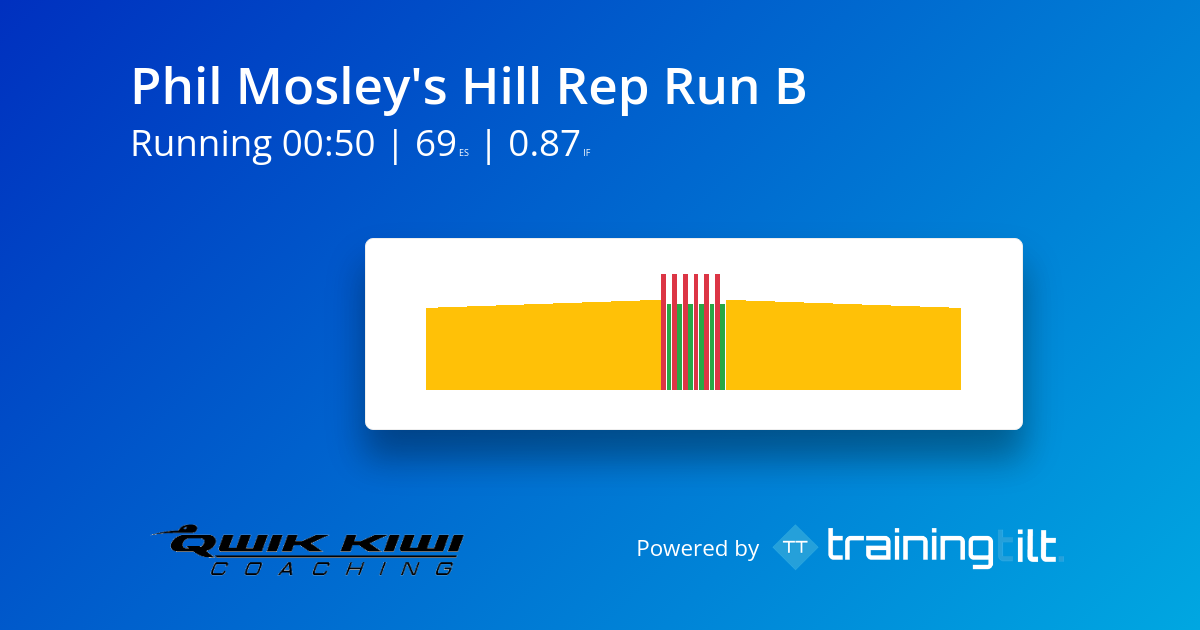 Running in hills develops leg strength as well as the strength of the tendons and ligaments around the knee and ankle. Developing leg strength is important, as it makes for a more powerful contraction of the leg muscles to propel you forward faster. Including hills regularly, particularly early in your build up will see great dividends in the improvement of your running. This workout is great to include early in your build up to develop leg strength.