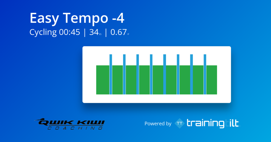 Tempo is the intensity that can be sustained for longer durations. It is the intensity that is used in marathon mountain bike events, Ironman and Ironman 70.3 events. This session gives lots of short exposures to this intensity. This workout is great to include early in a build up, or later in a build up to enhance aerobic efficiency or as a recovery session.