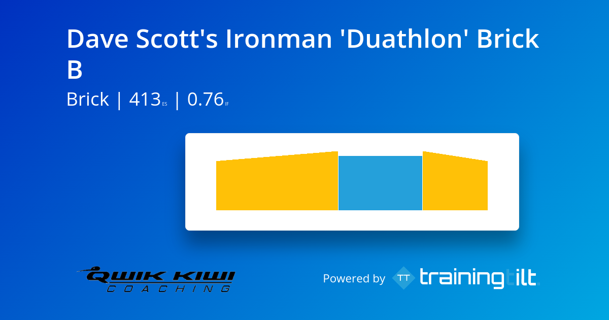 Dave Scott likes to use the standard duathlon for long bricks. by dividing the run into two segments makes it a little easier on the body. This session is great for early season Ironman athletes as they build into their biggest weeks. It can also be of benefit for Ironman 70.3 athletes.