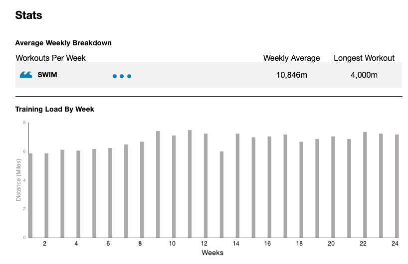 Starting 24 weeks before the YOUR next Iron-distance event, this plan progresses through phases to build you to your peak performance. Each week typically contains three swims each week. You will build up to: 4,000 metres swimming in a single session. Although not necessary, I recommend using a swim monitor (eg. Garmin Forerunner 735, 920 or 935) to track your sessions in the pool.