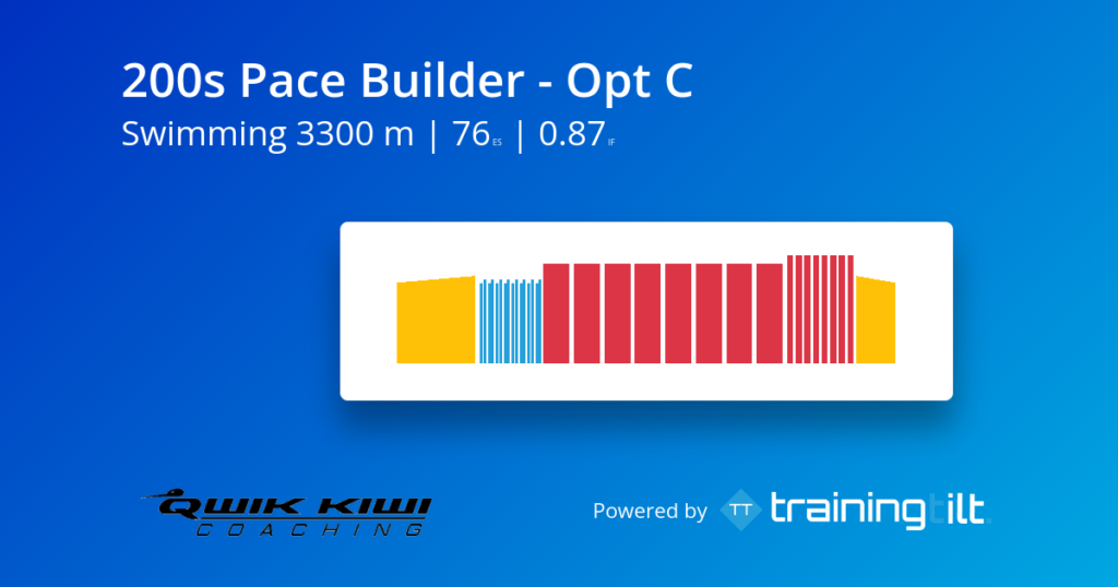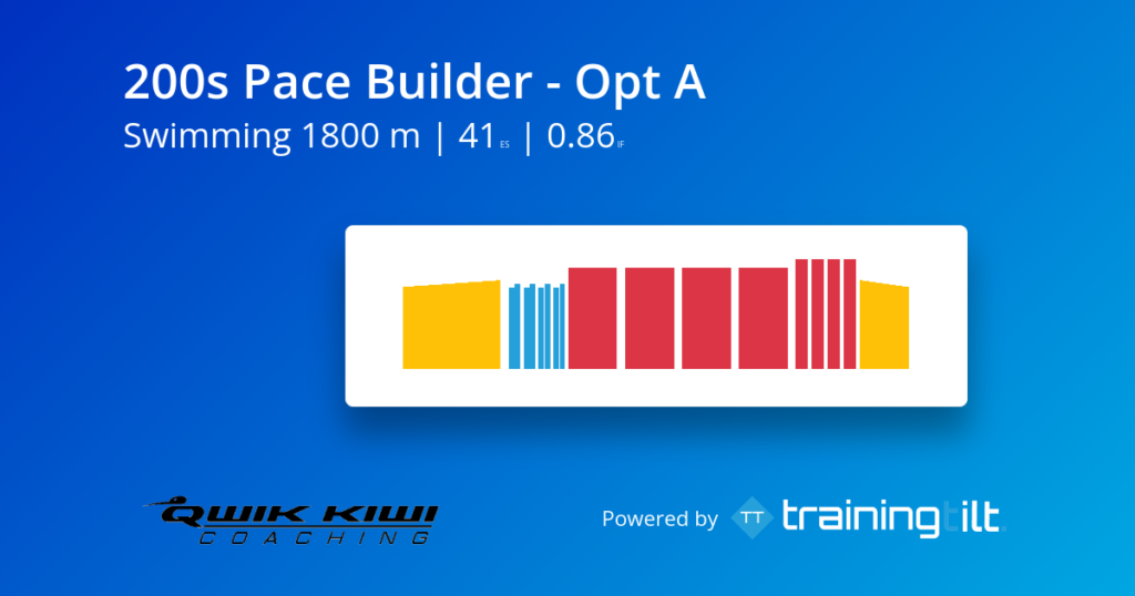 The 200s Pace Builder is designed to help you lock into a strong, sustainable rhythm and hold it across longer repeats. The drill/swim 50s at the start reinforce good technique before you move into the main set of 200m reps where pacing and consistency matter most. Finish with short, fast 50s to wake the legs up and sharpen your speed under fatigue. It’s a balanced session that builds endurance, pacing awareness, and durable swim speed — perfect for triathletes and open-water swimmers who want their pace to feel controlled rather than forced.